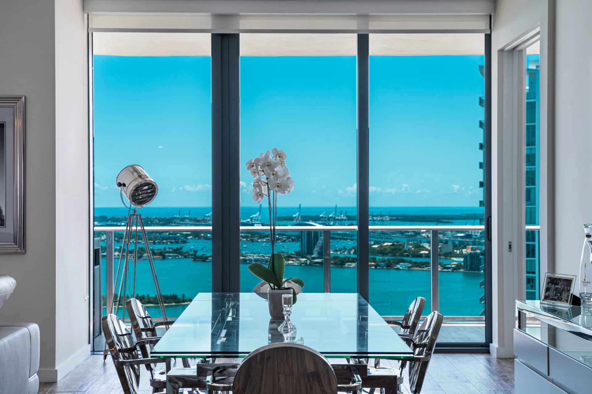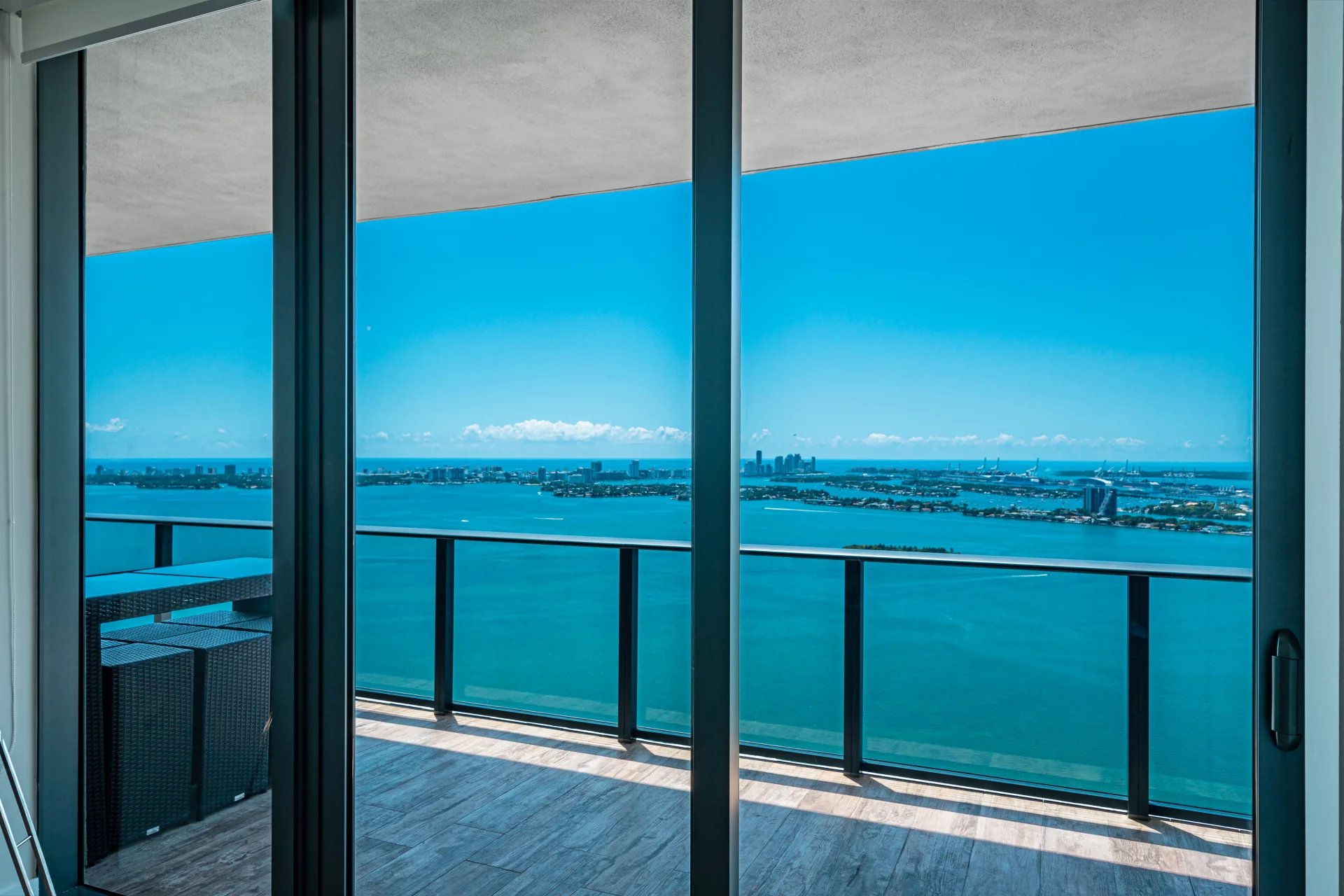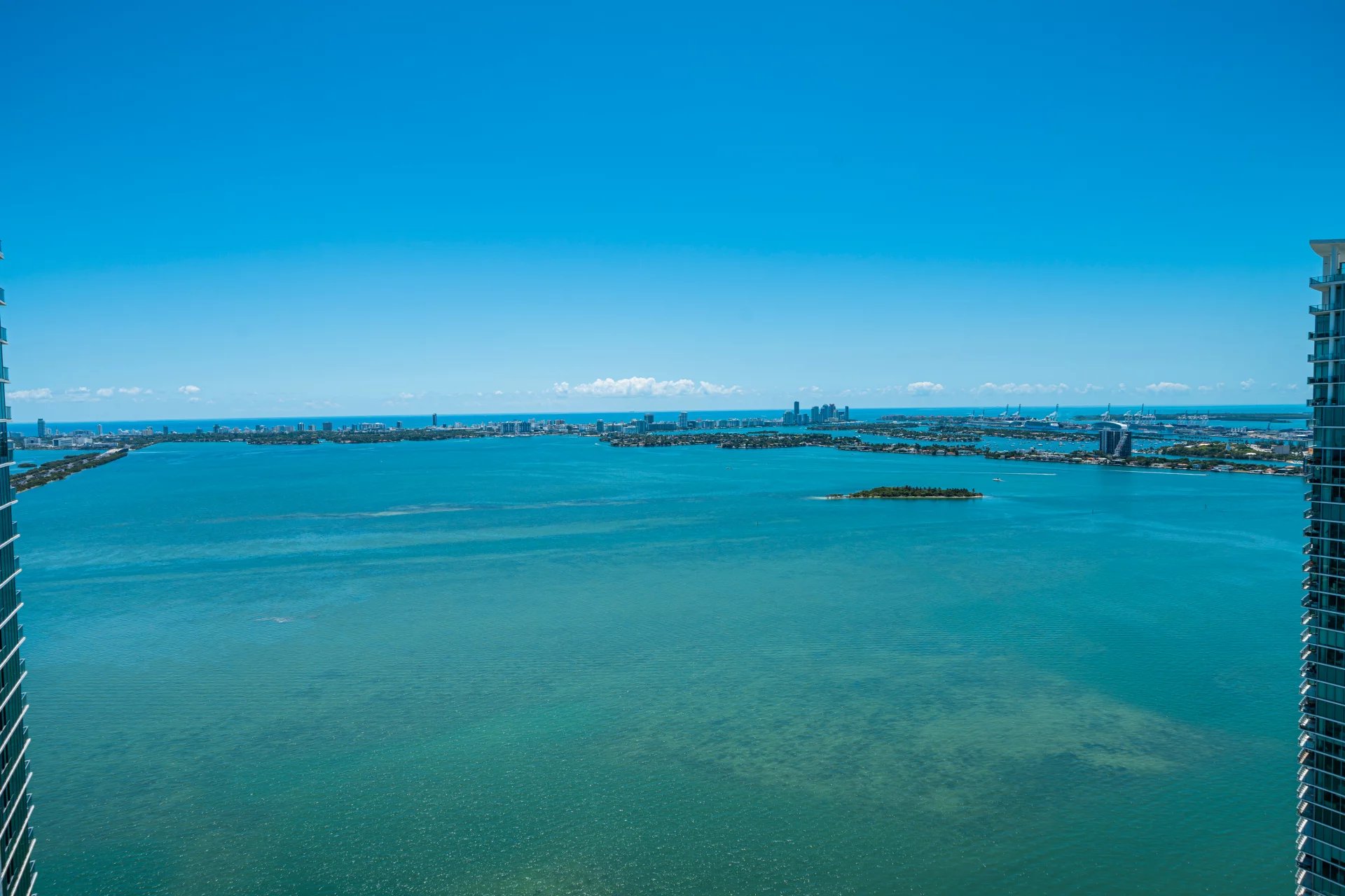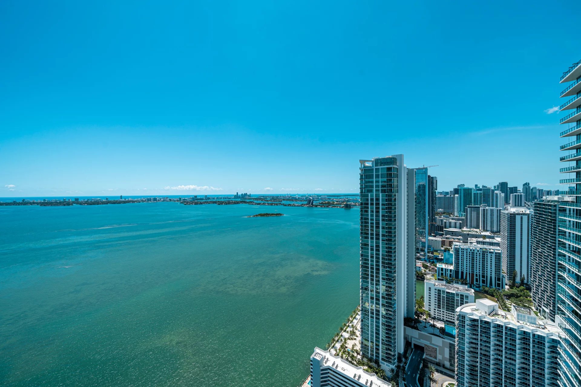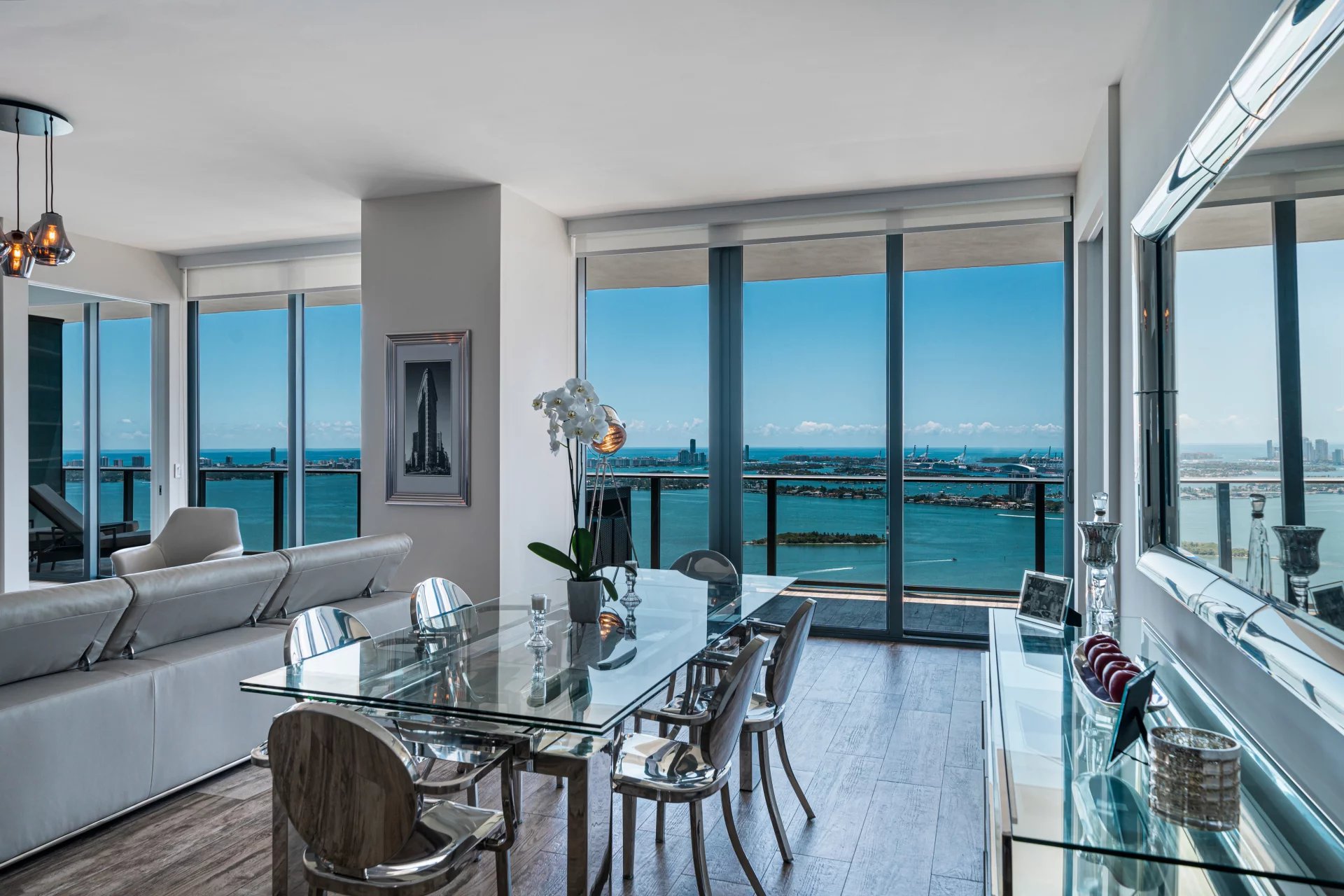 It features a large living room, high ceilings, breathtaking panoramic views of the bay, ocean, Miami Beach and Miami skyline.