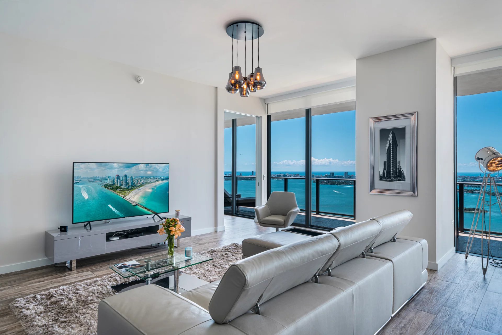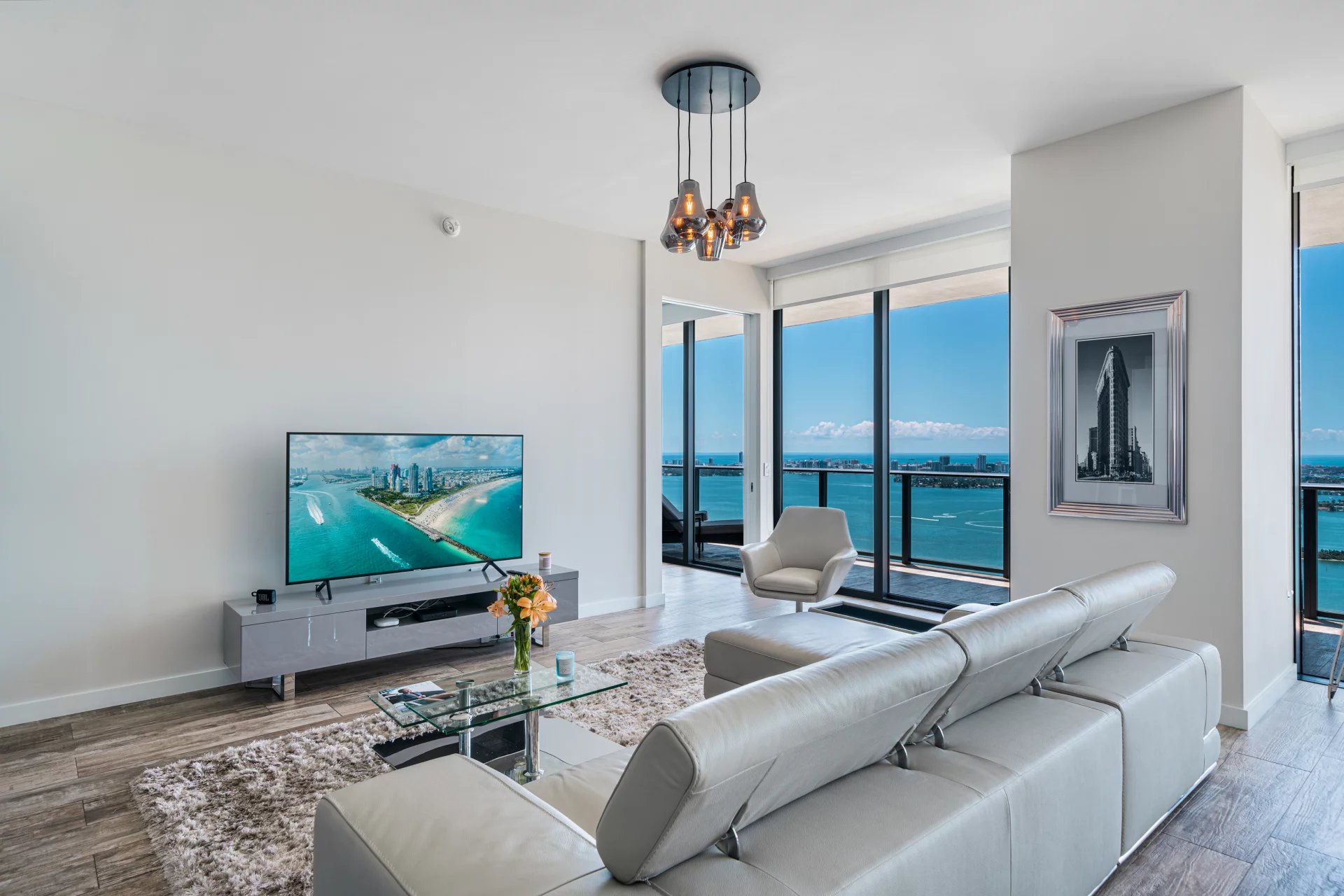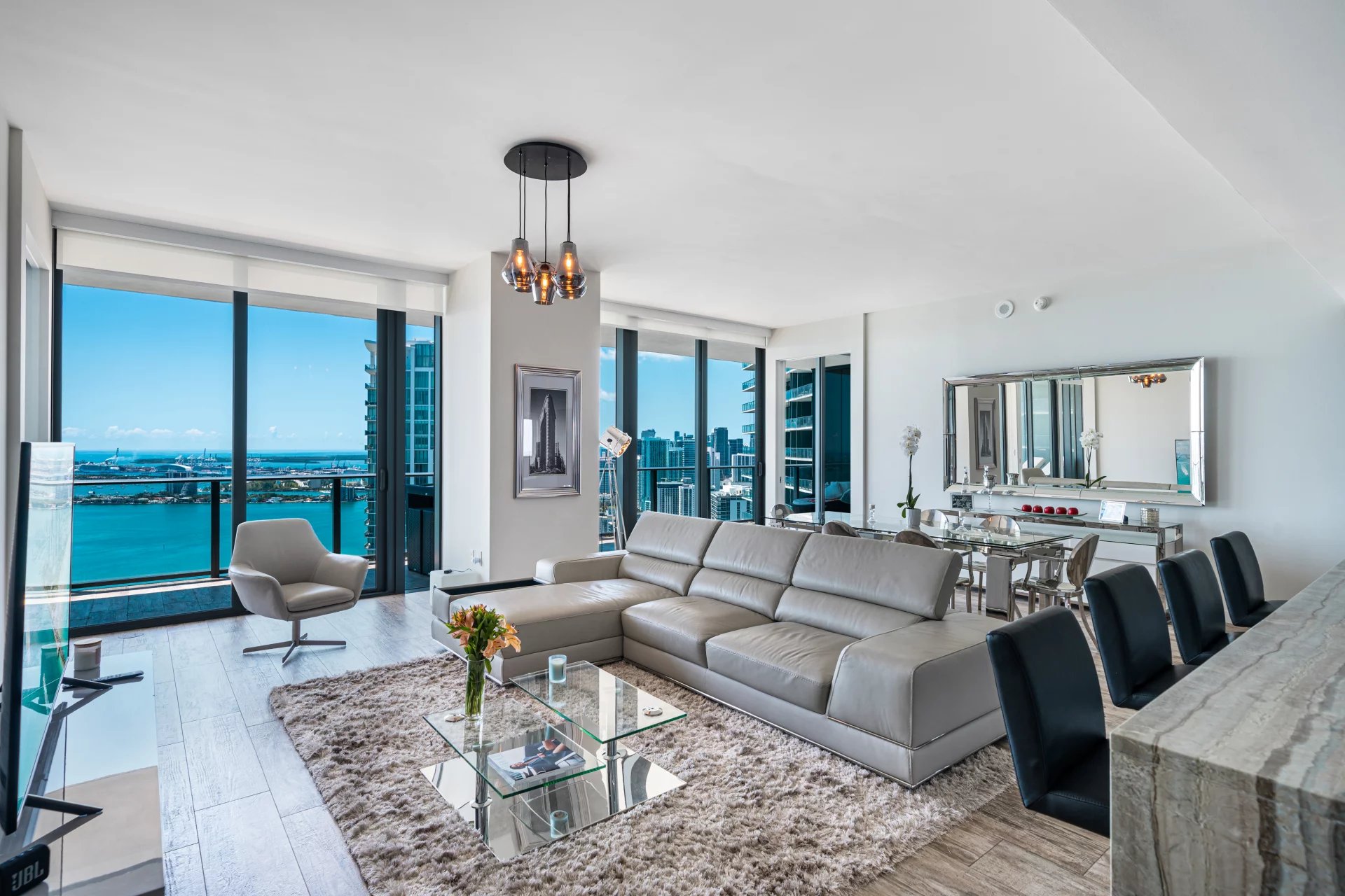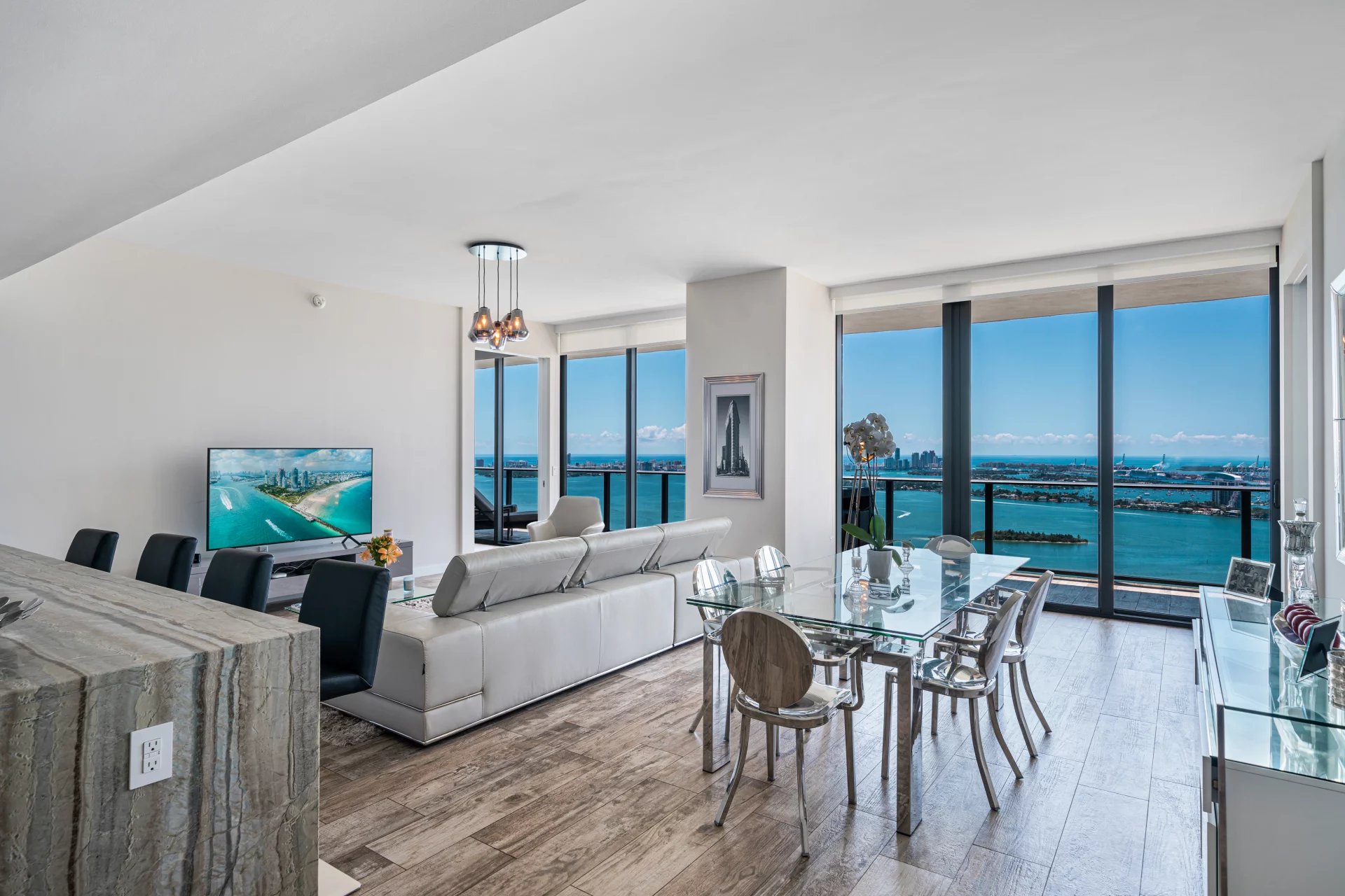 It features a large living room, high ceilings, breathtaking panoramic views of the bay, ocean, Miami Beach and Miami skyline.