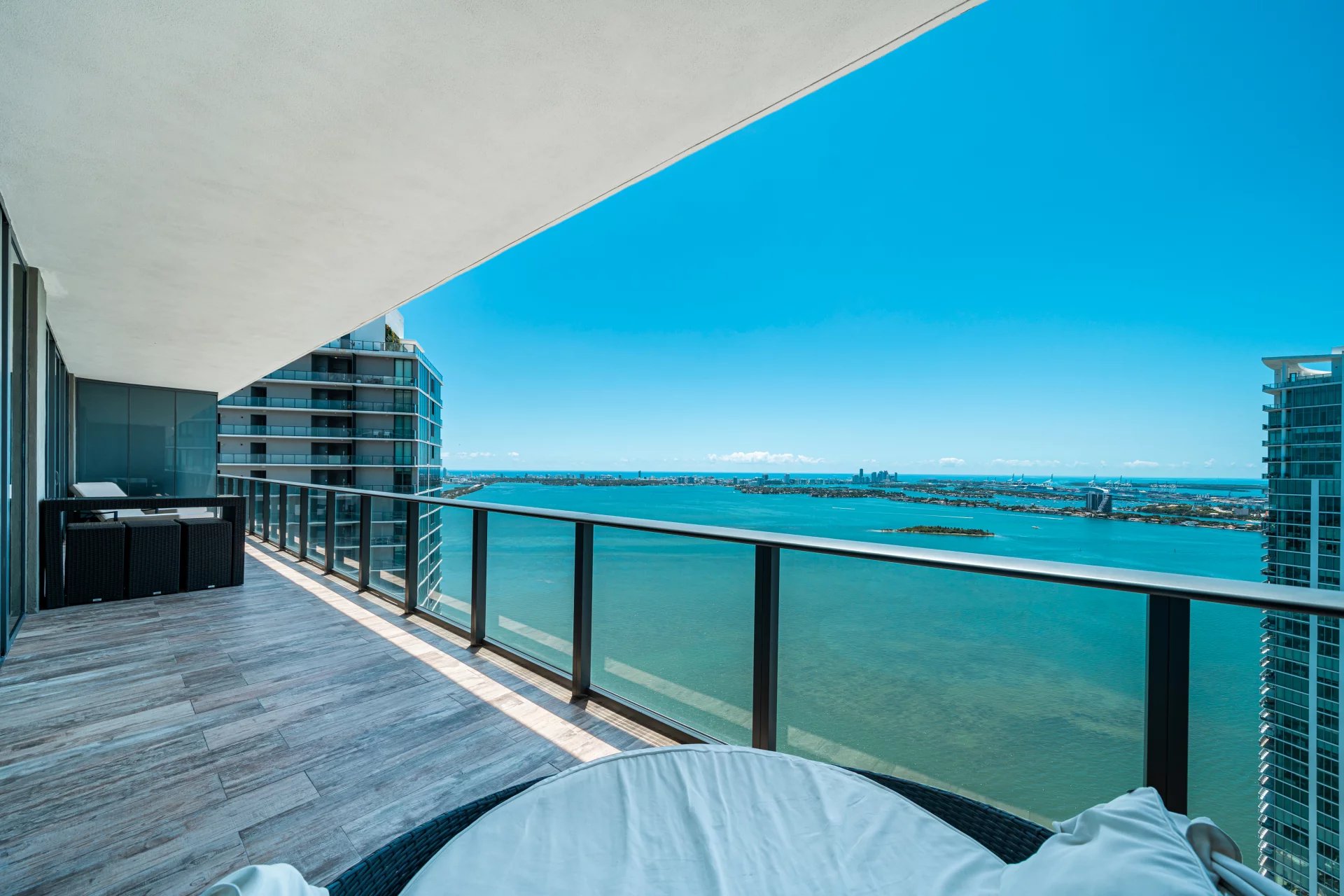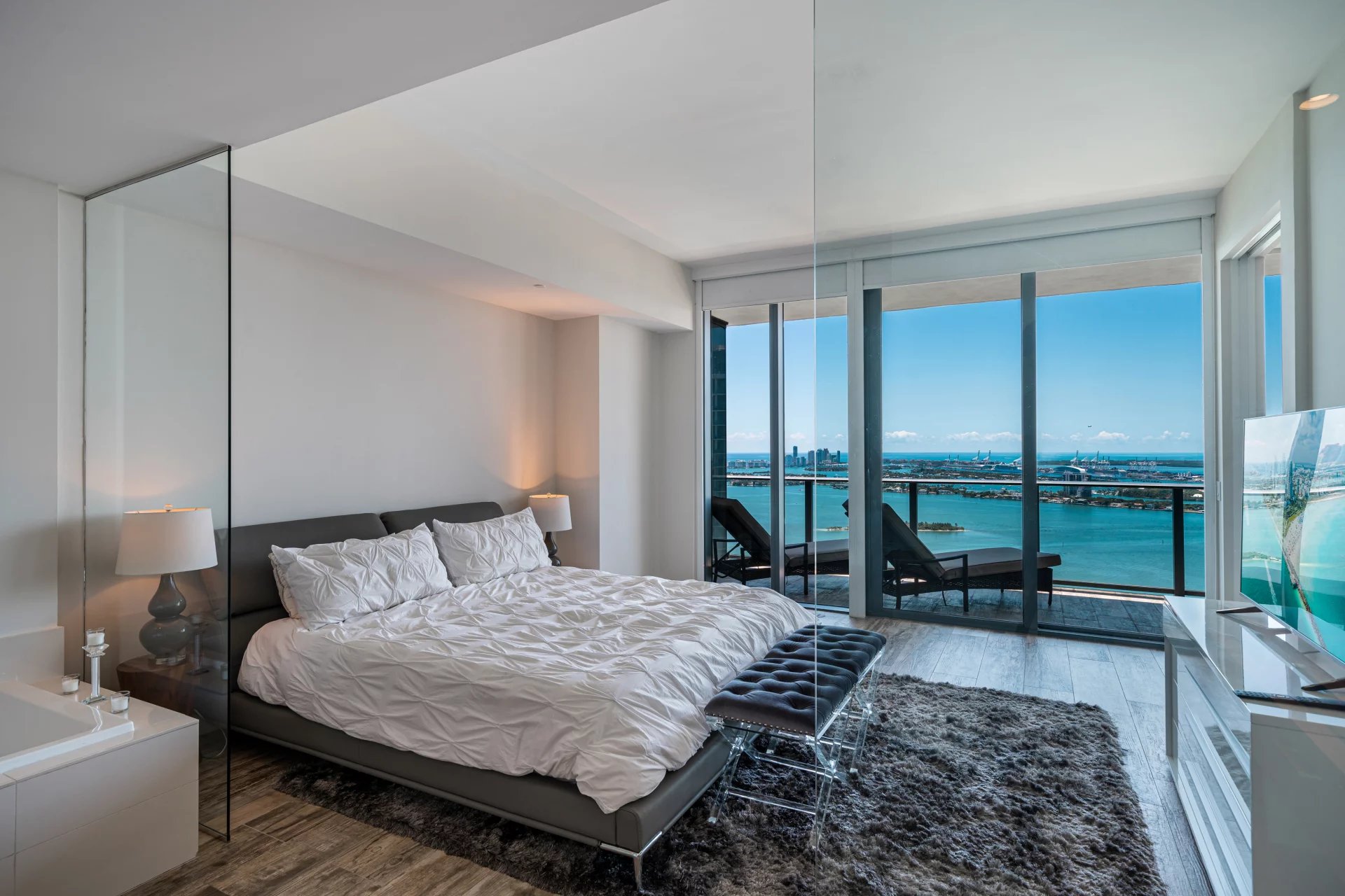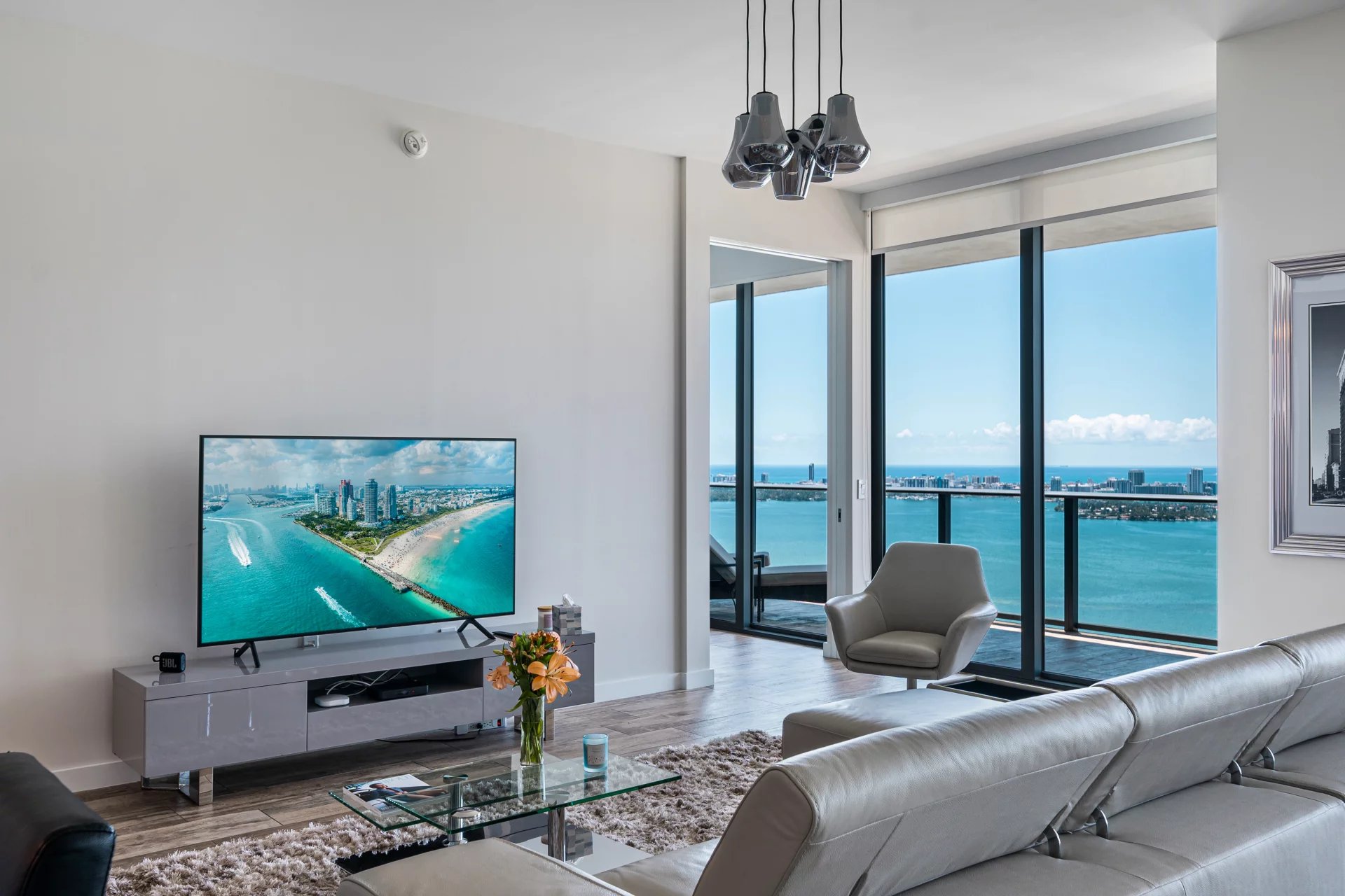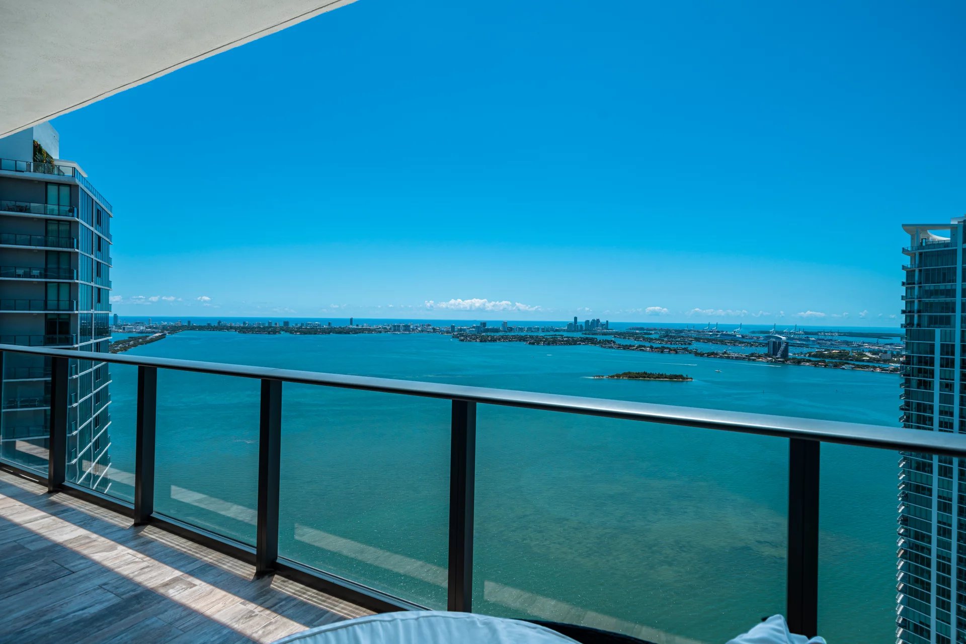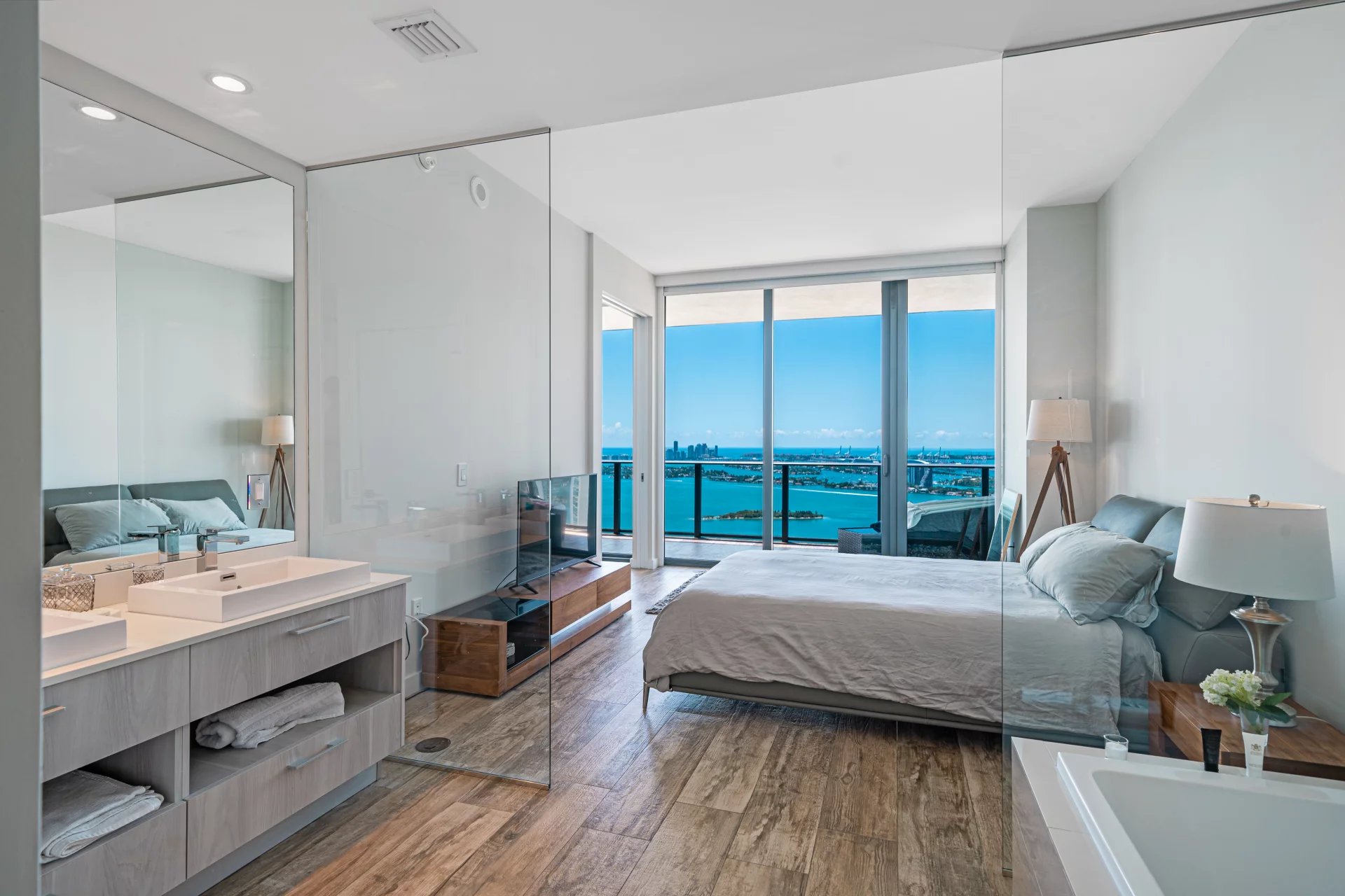 It features a large living room, high ceilings, breathtaking panoramic views of the bay, ocean, Miami Beach and Miami skyline.