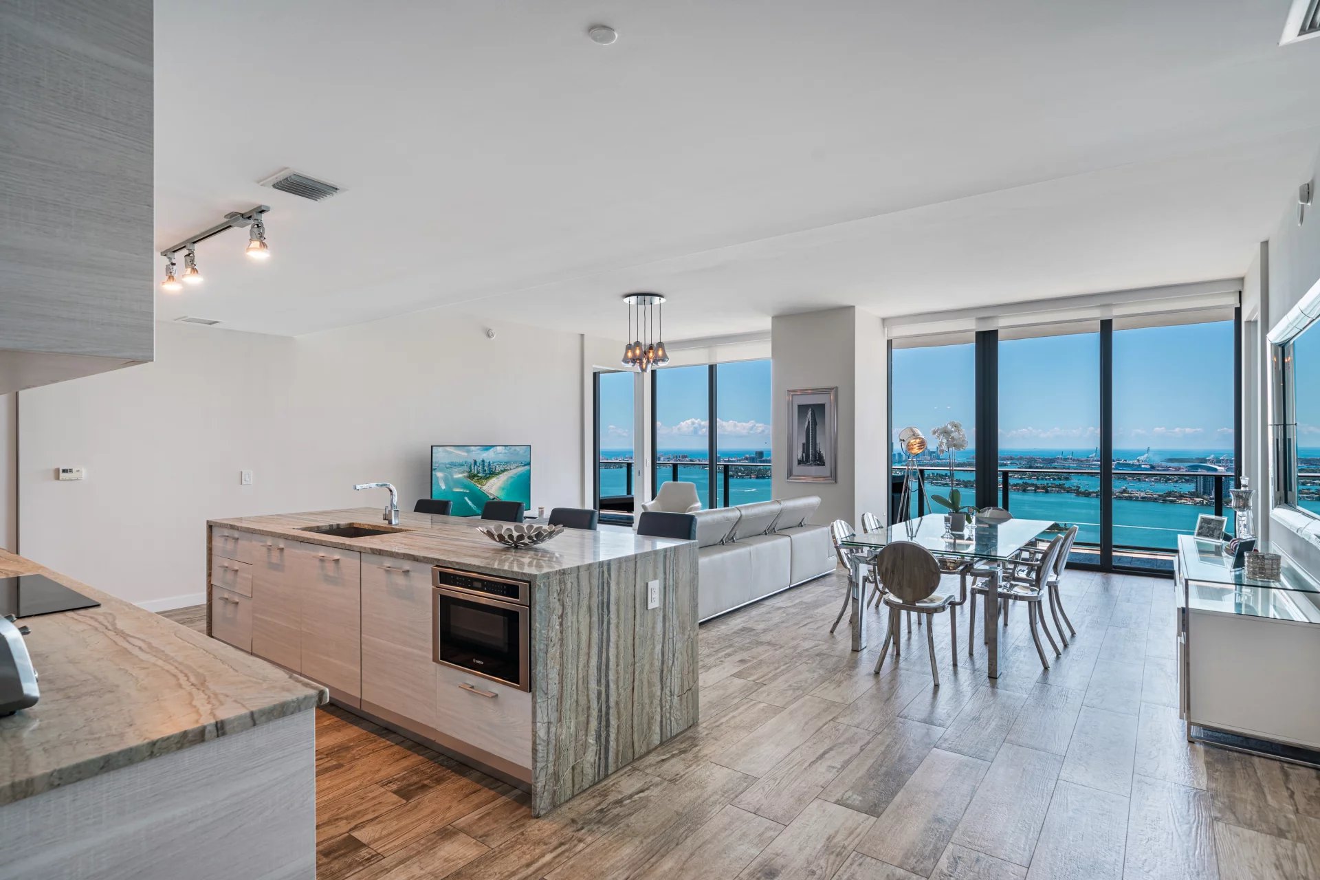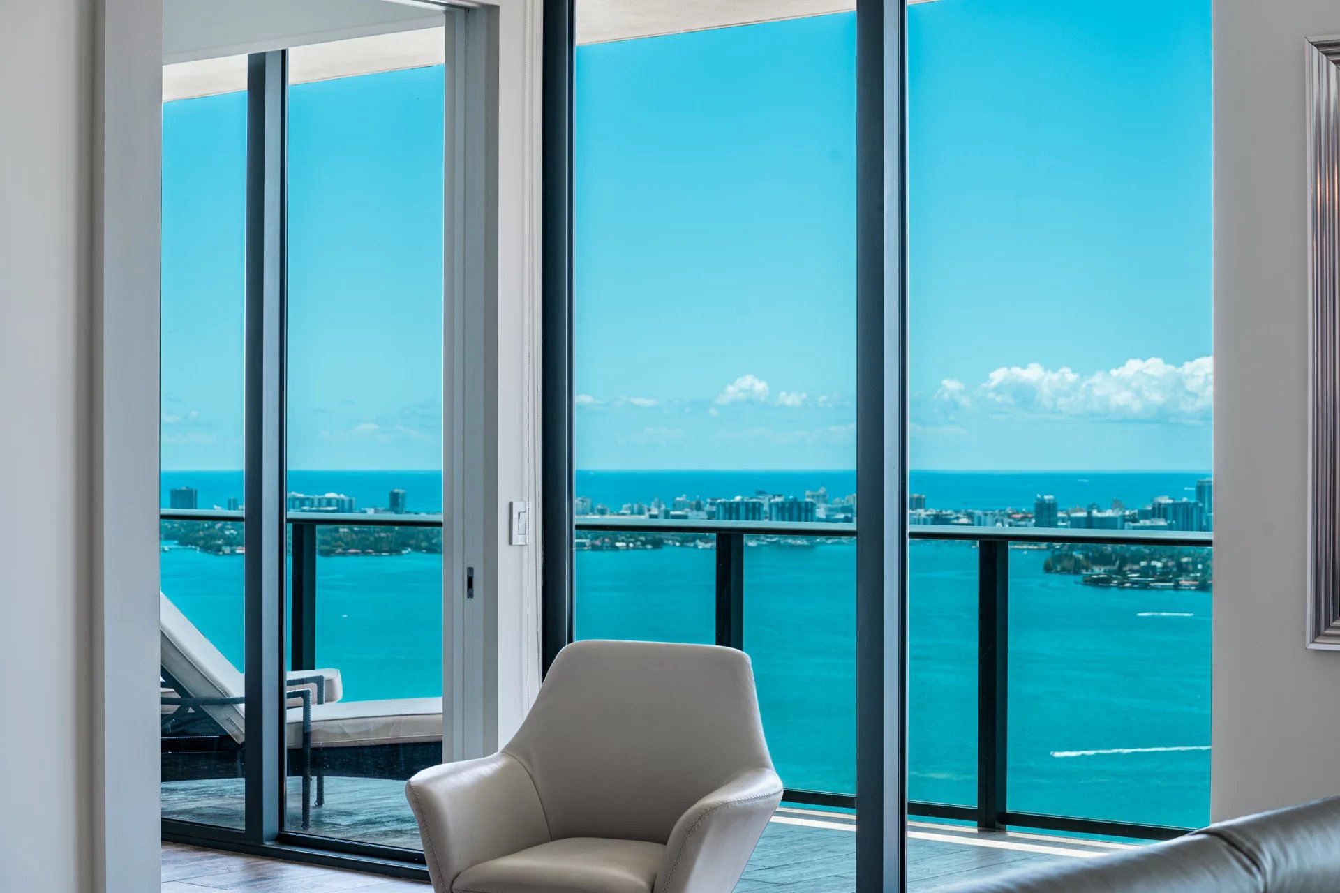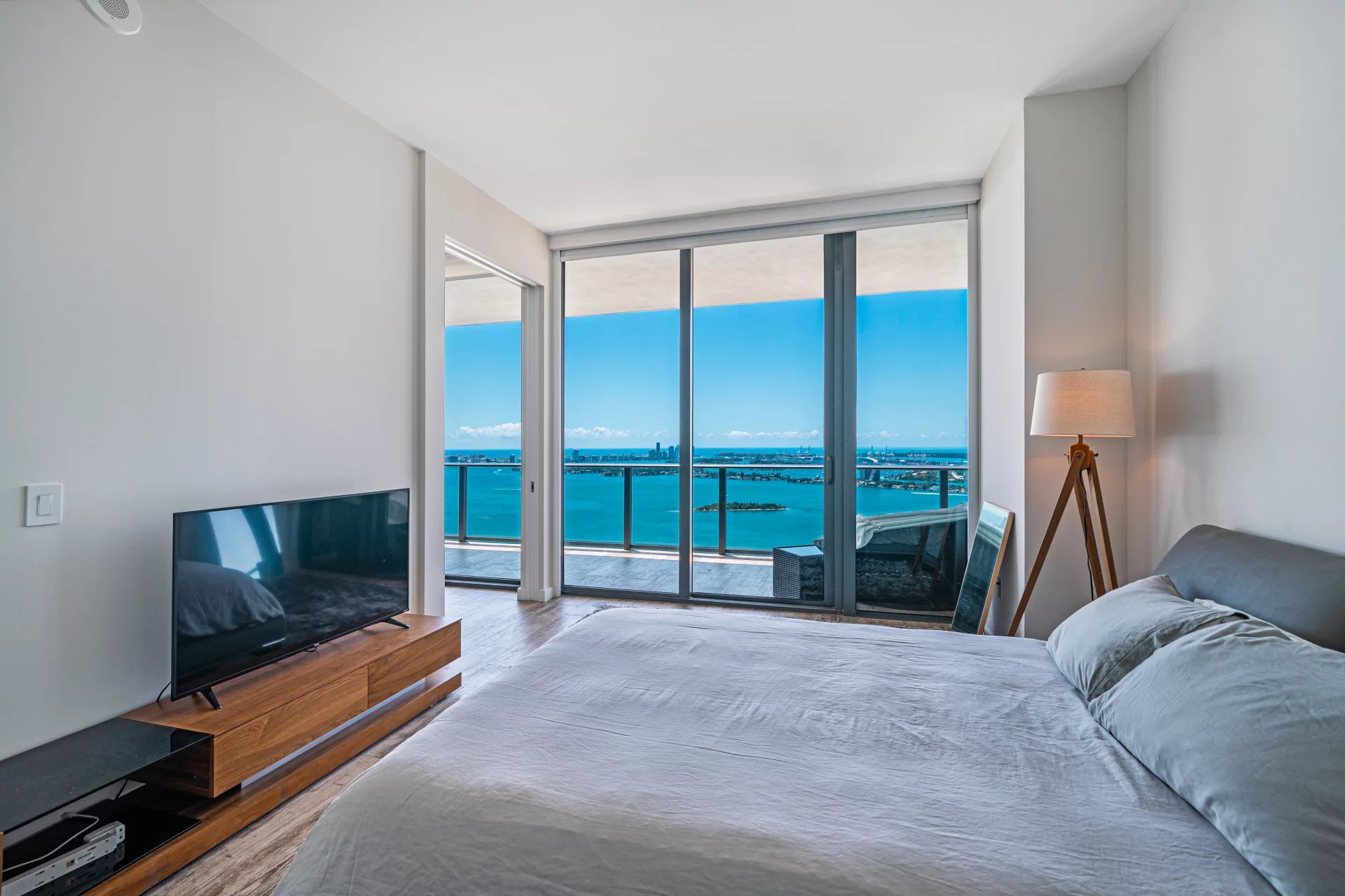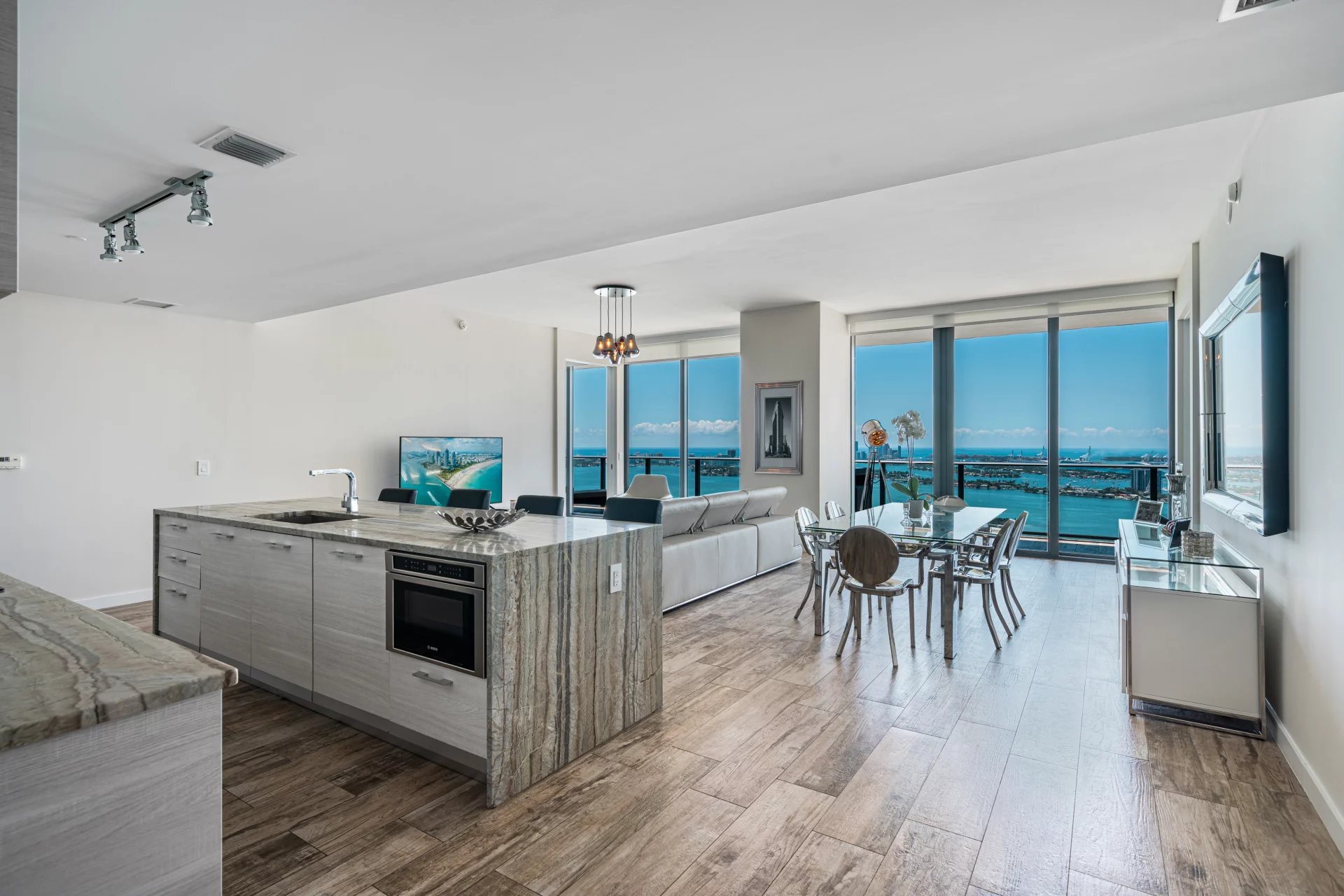 It features a large living room, high ceilings, breathtaking panoramic views of the bay, ocean, Miami Beach and Miami skyline.