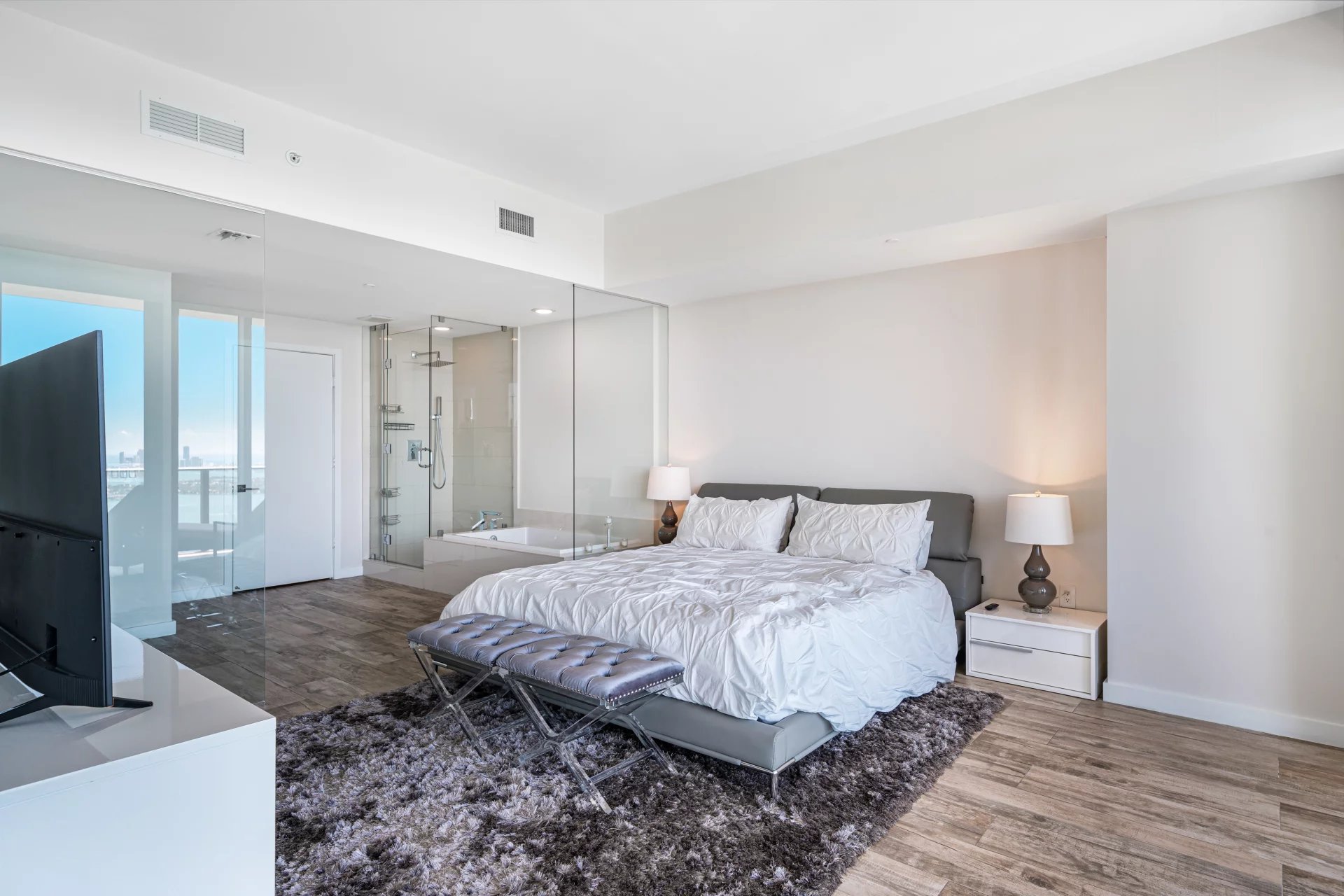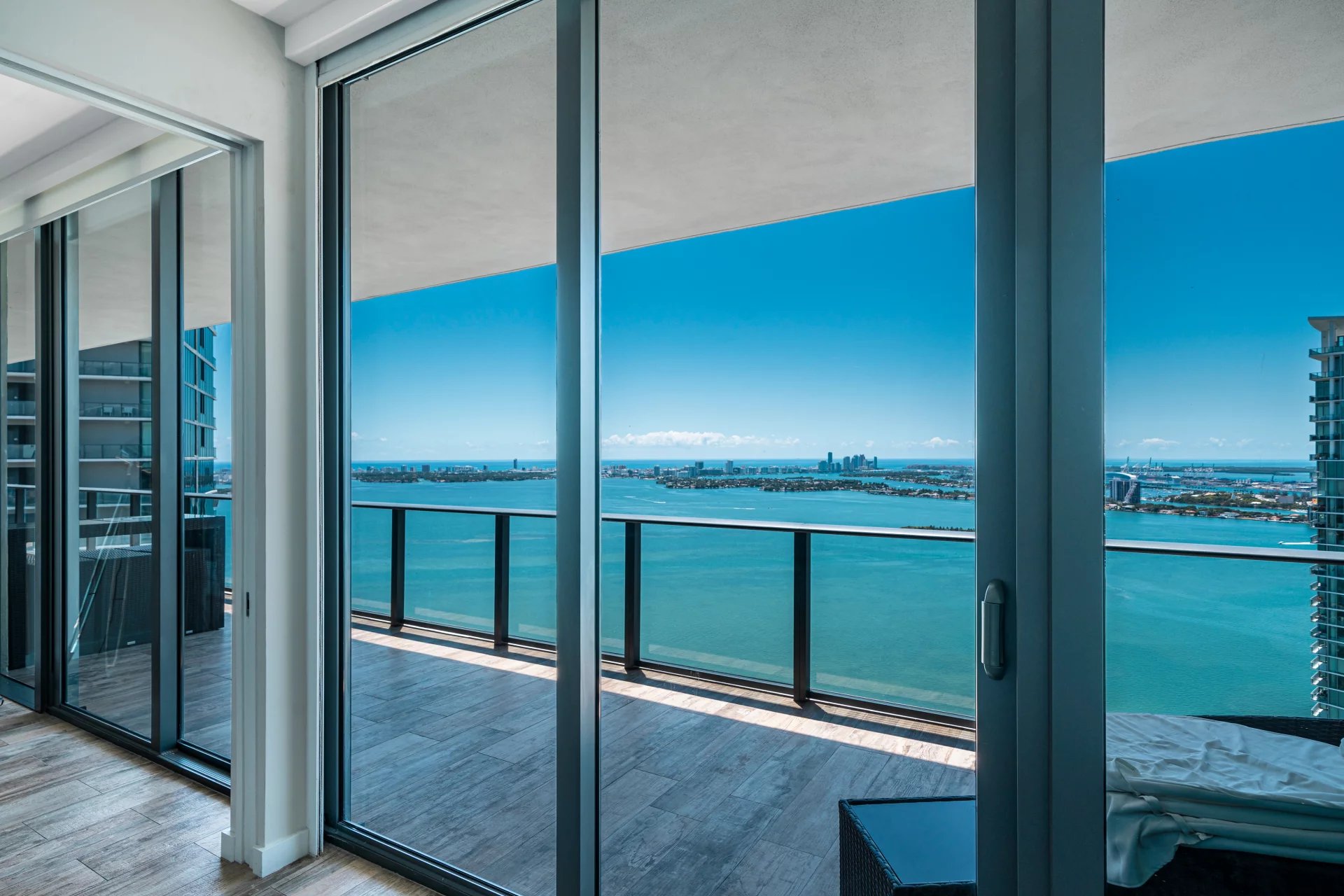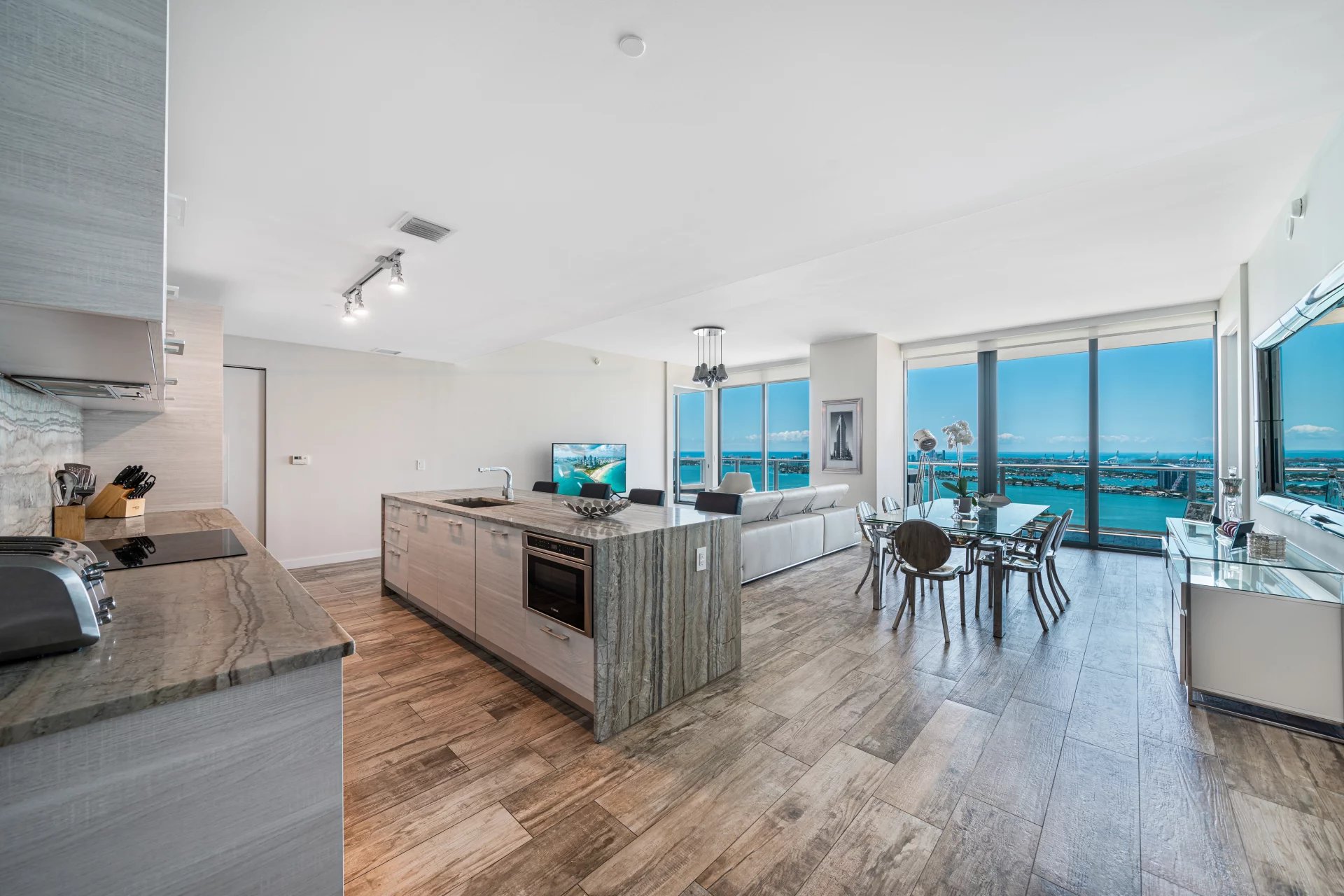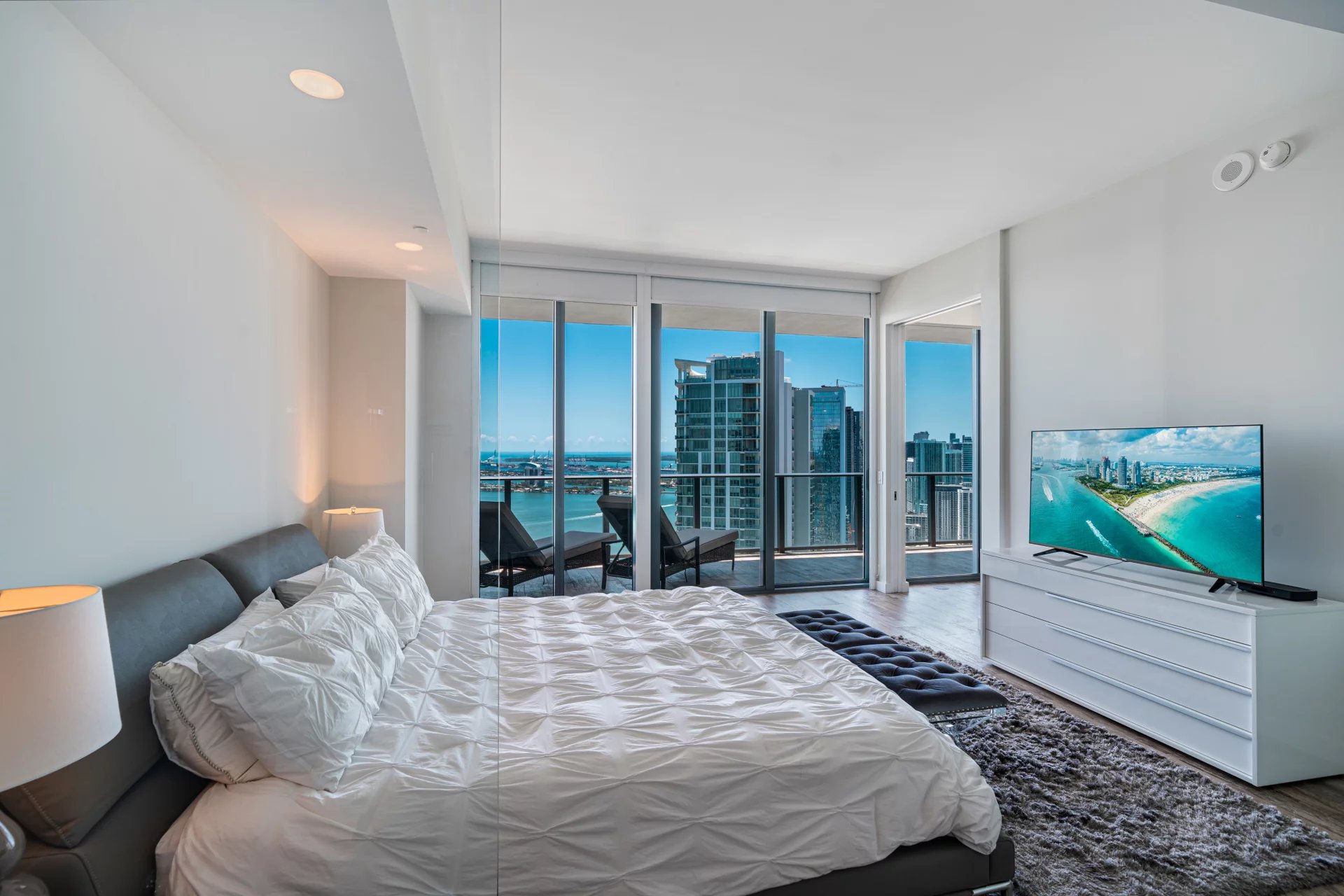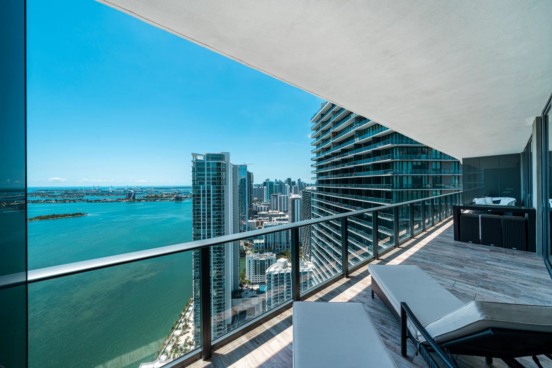 It features a large living room, high ceilings, breathtaking panoramic views of the bay, ocean, Miami Beach and Miami skyline.