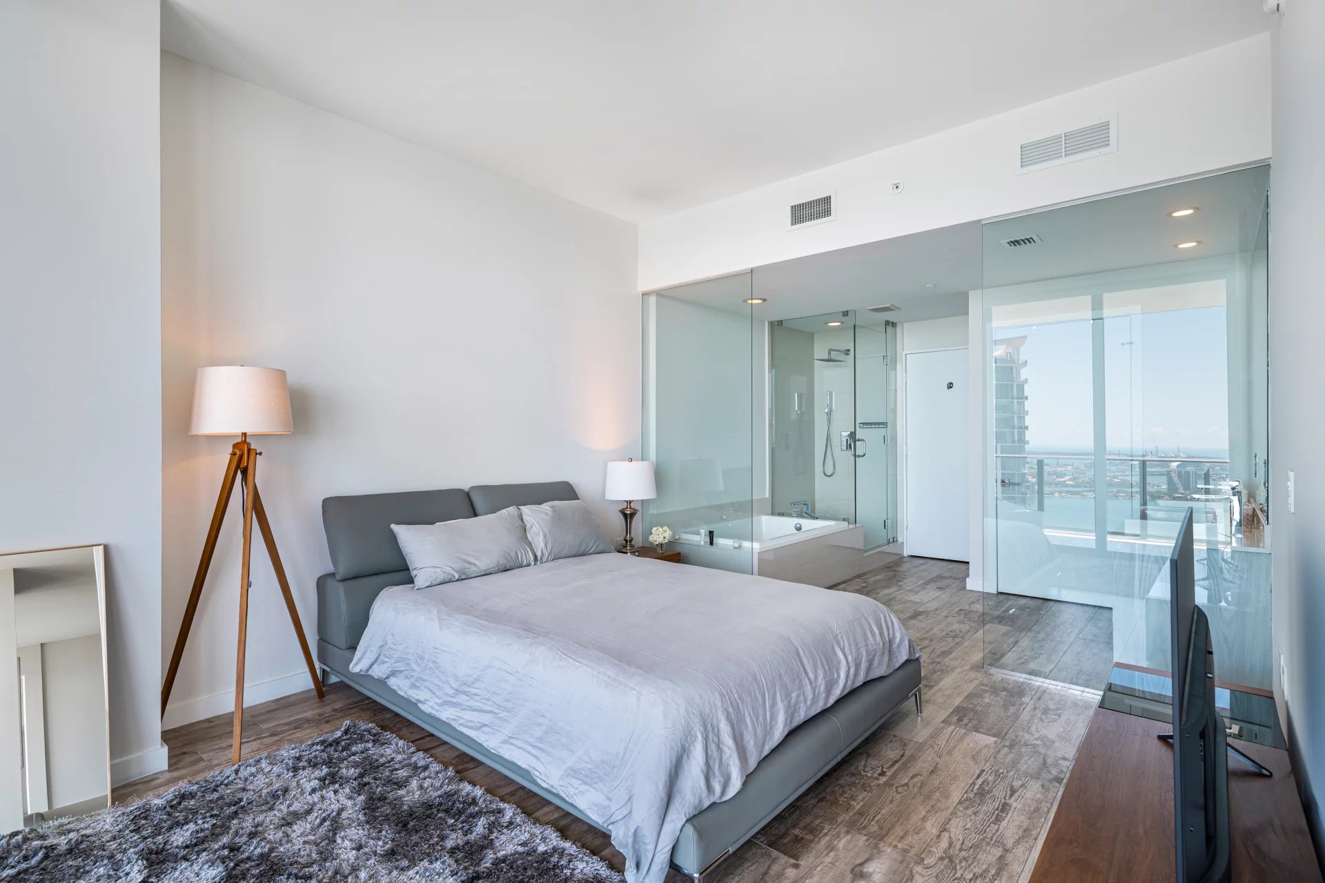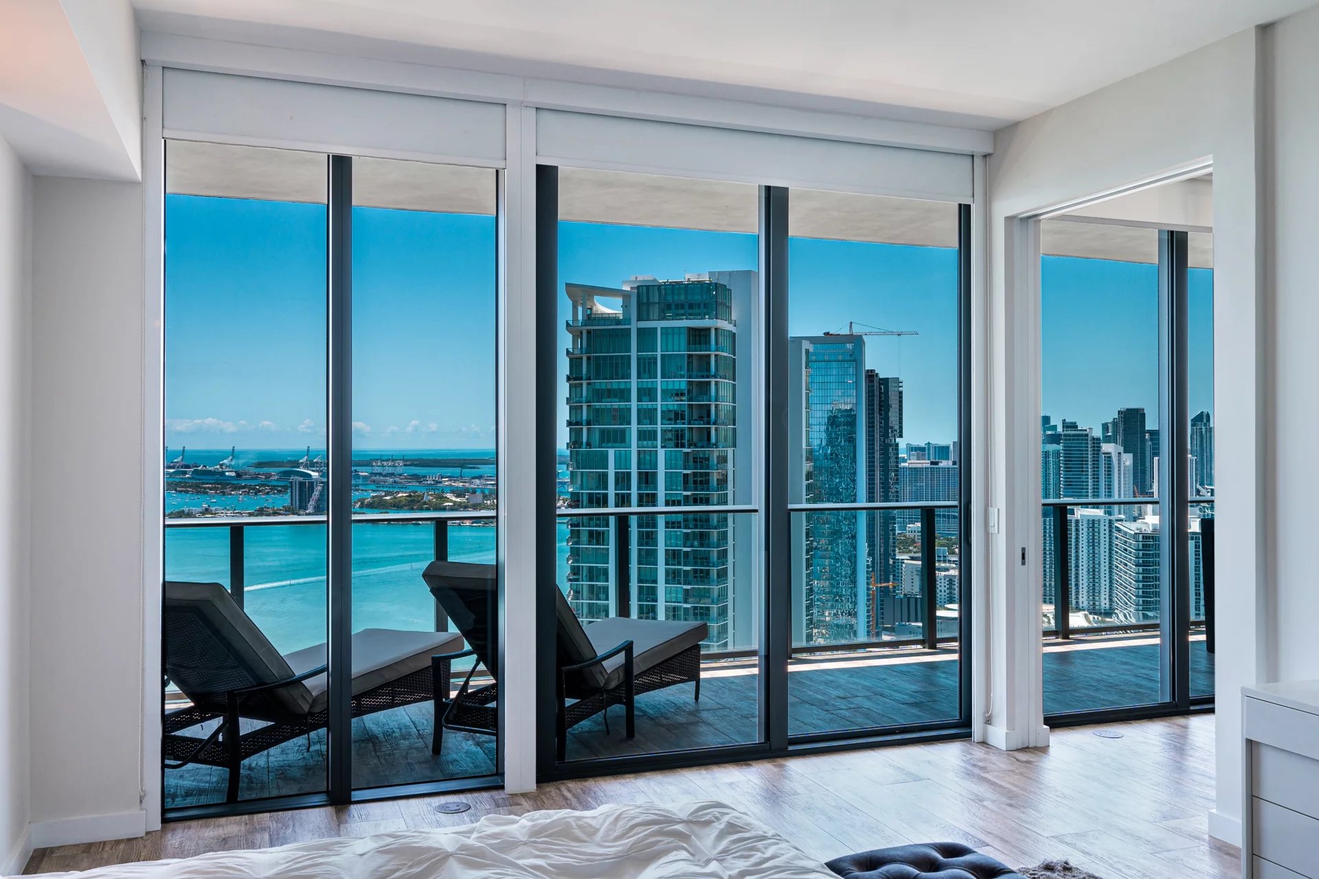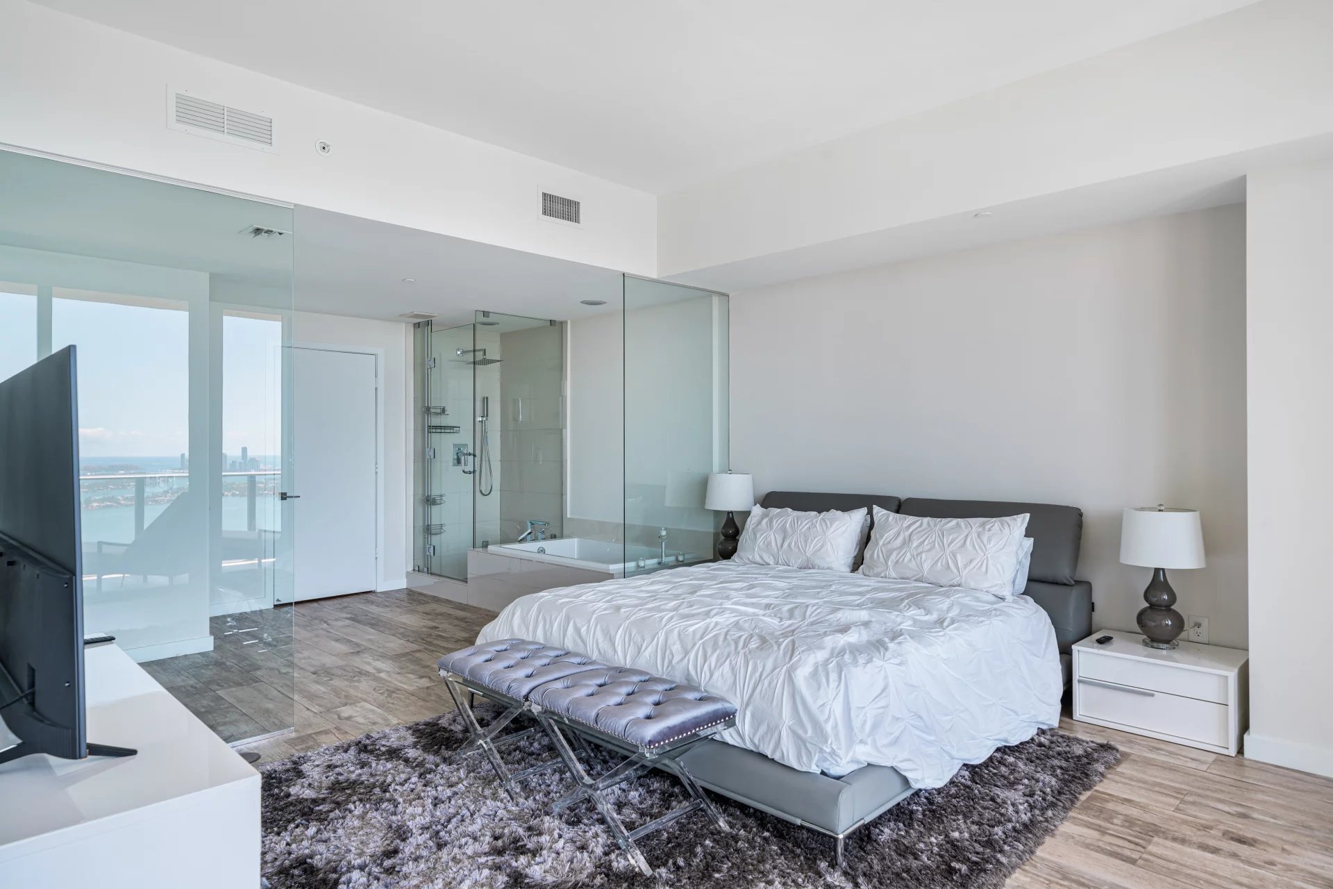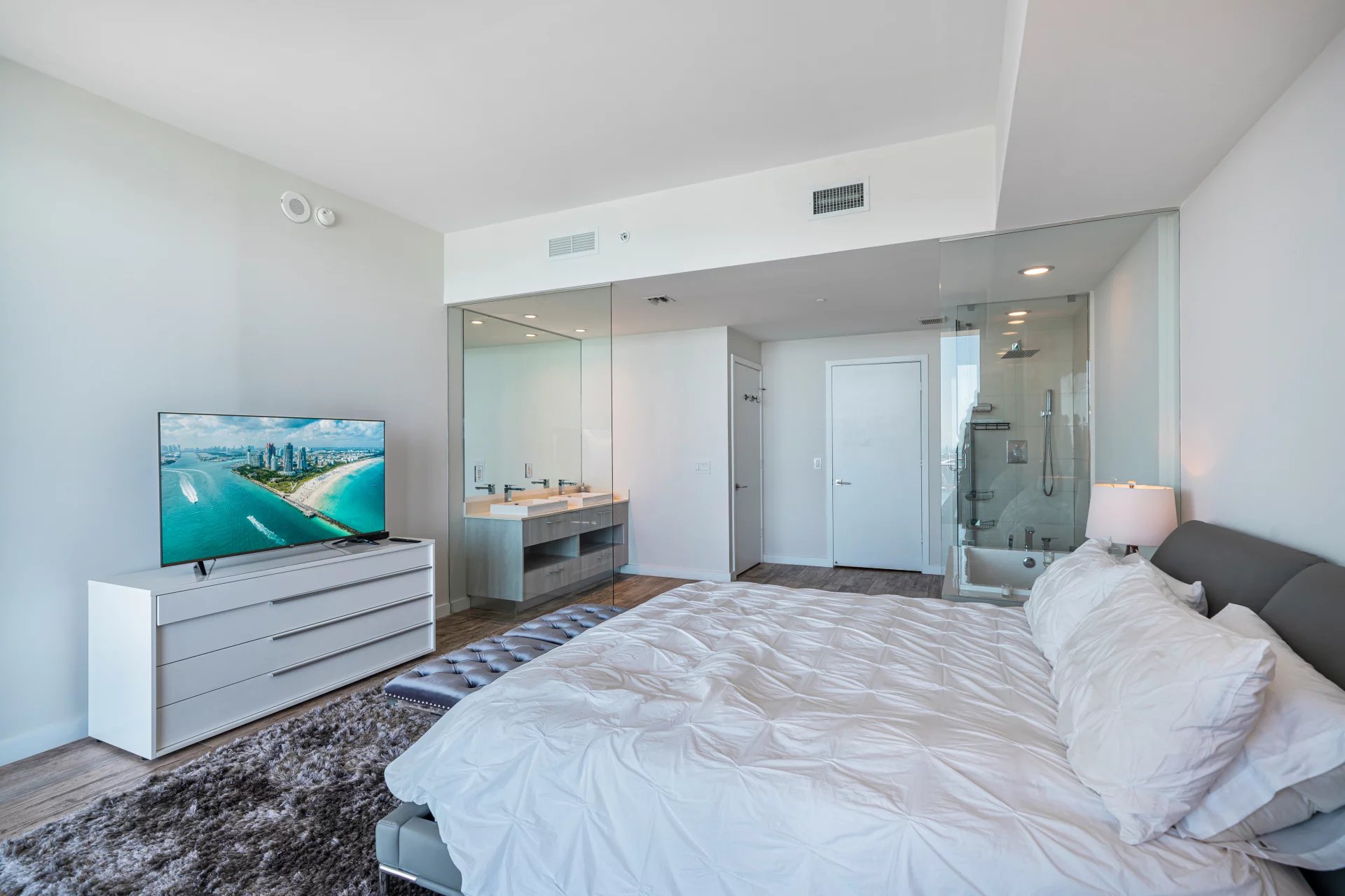 It features a large living room, high ceilings, breathtaking panoramic views of the bay, ocean, Miami Beach and Miami skyline.