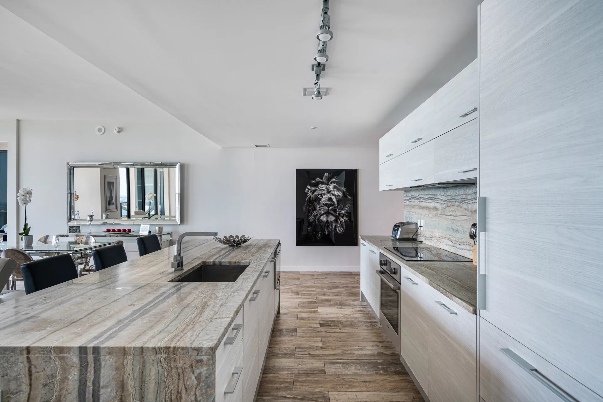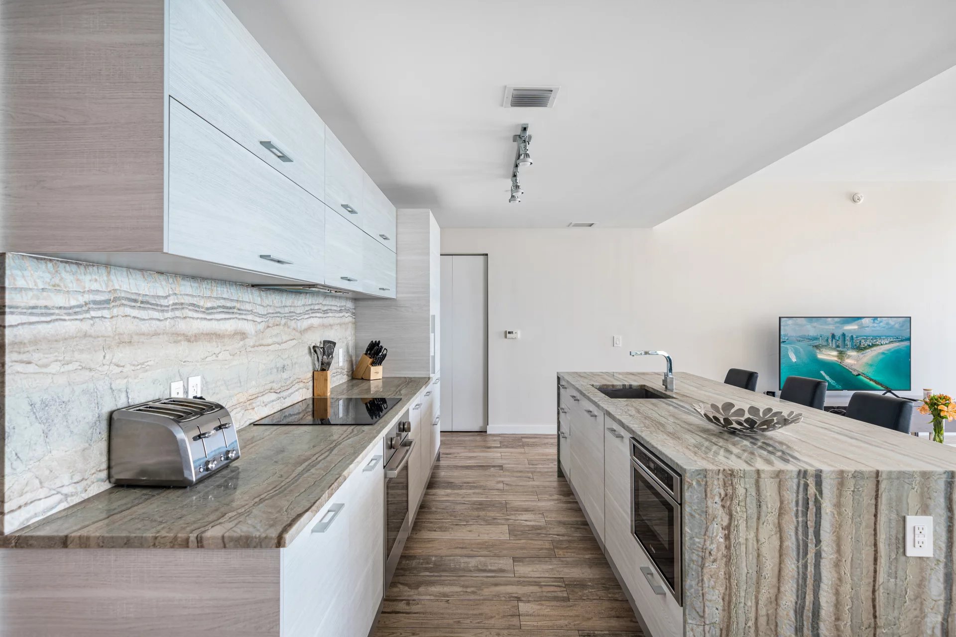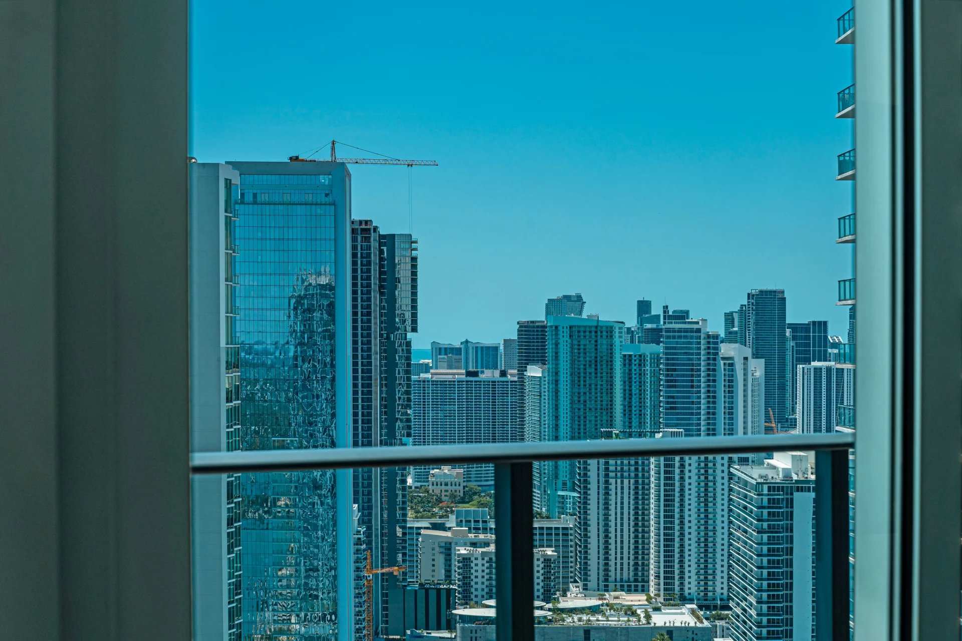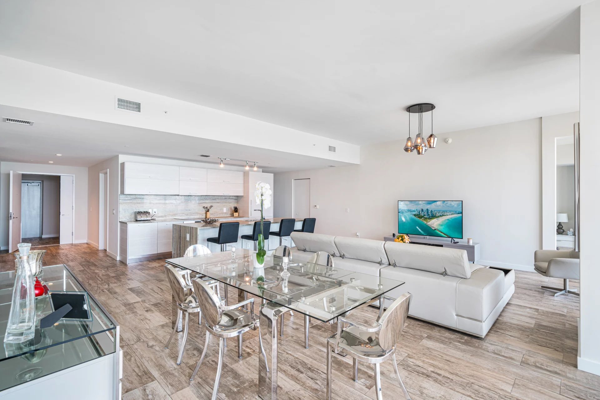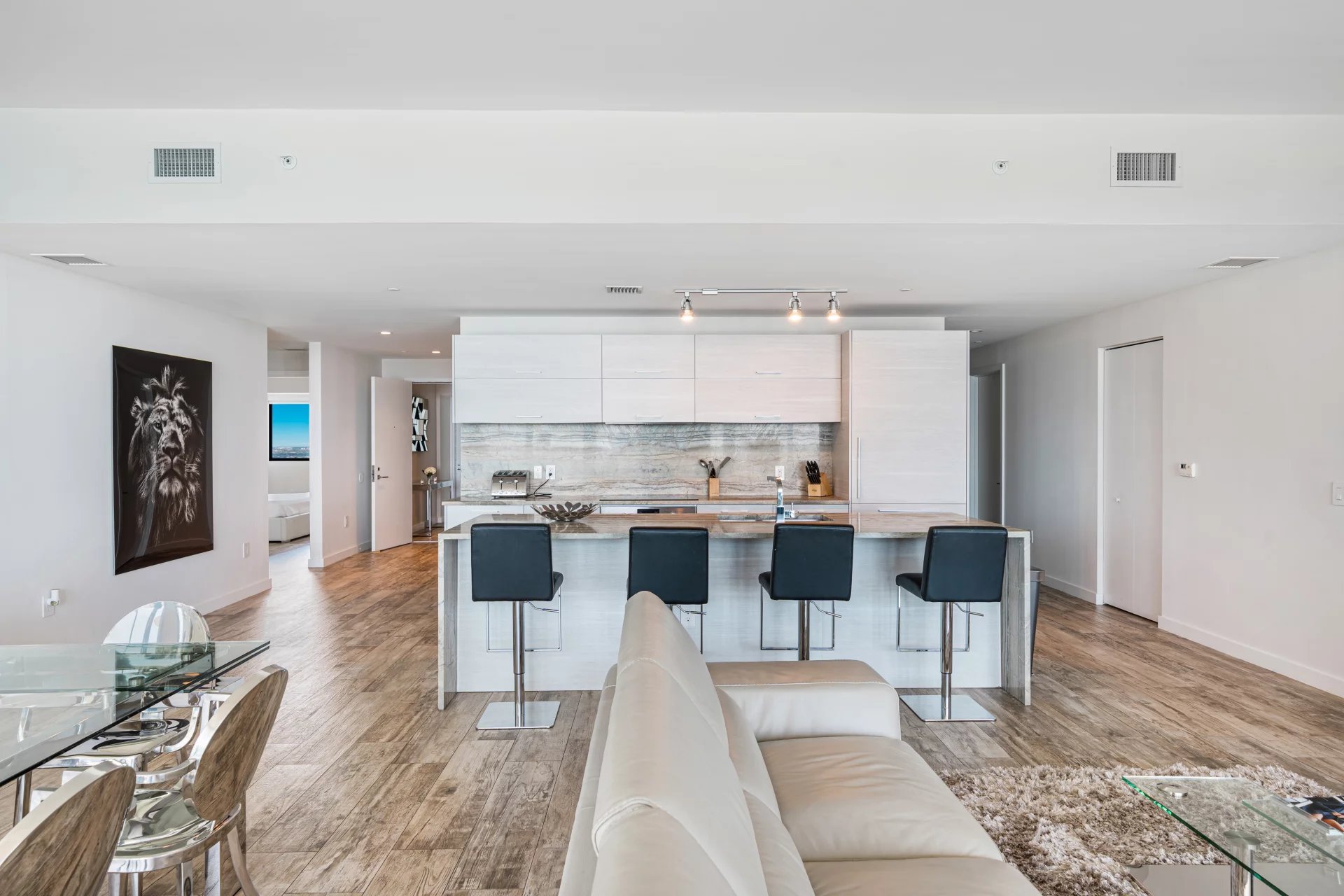 It features a large living room, high ceilings, breathtaking panoramic views of the bay, ocean, Miami Beach and Miami skyline.