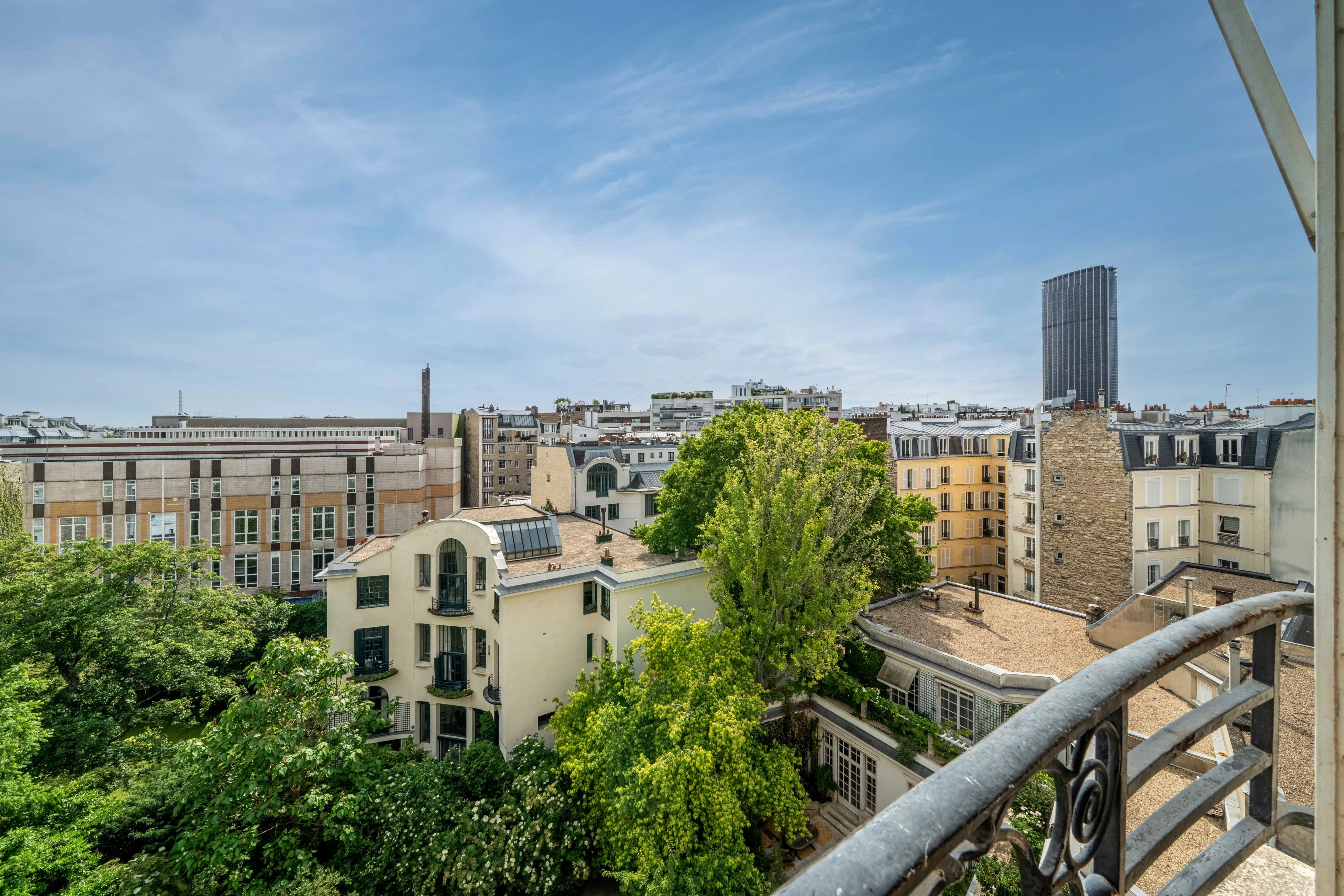 This crossing property, bathed in light thanks to its Southeast exposure, is charming for its absolute calm and unobstructed views of the gardens and rooftops of Paris.